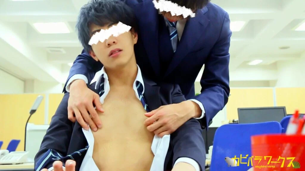 仕事に集中したくても、先輩社員かい君からの執拗な攻めに、エロいゆーた君もビクッビクッ何度も敏感に感じてしまいます。しかし、期限が近い業務があるのか、どうにか仕事を続けますが、とうとう、ゆーた君は、徐々に欲望に負けてしまいます。
